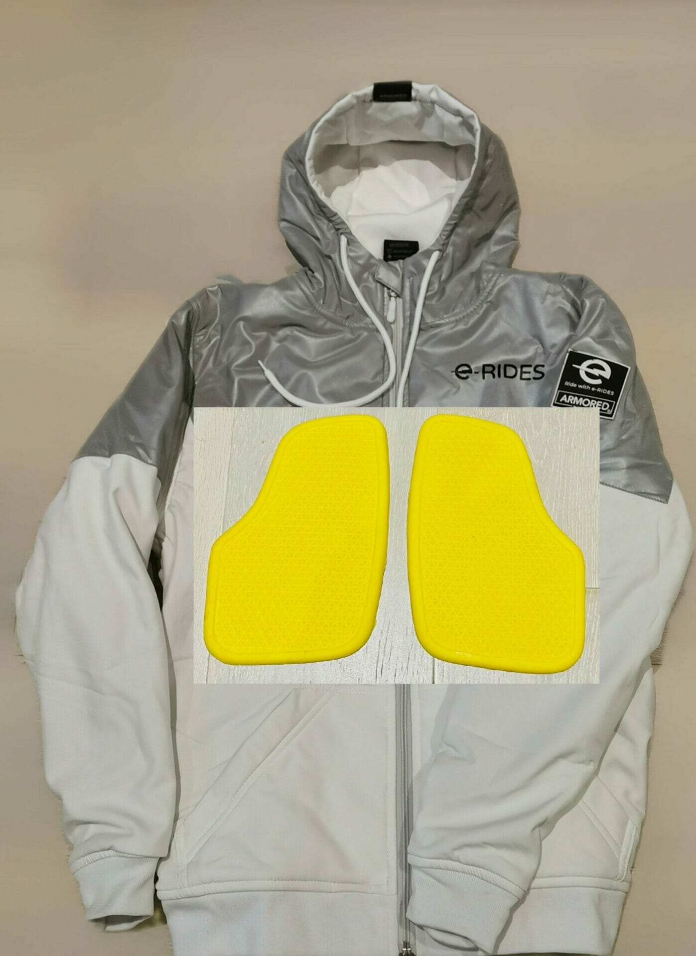 This is the e-RIDES ARMORED reflective jacket with Chest protector, designed in partnership with LAZYROLLING. Comes in e-RIDES traditional Yellow, Hot Pink, Blue and Arctic White.