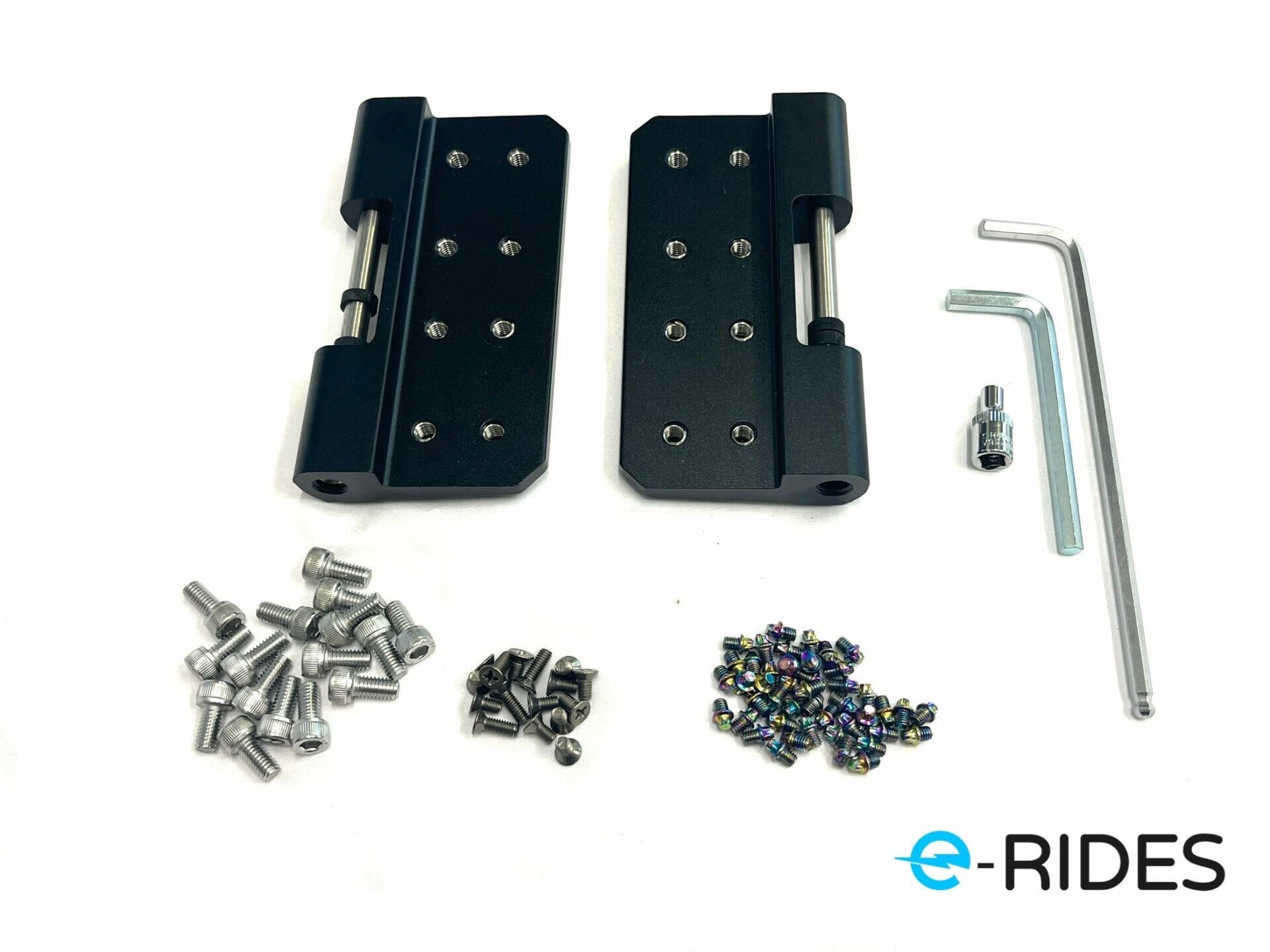 This is the e-RIDES Pedals with Honeycomb removable spikes, code names wolverine, Ironman, Naked and Noir. The e-RIDES Pedals comes with a two piece design, the same alloy material used by Apple for iphones. The e-RIDES honey comb pedals are CNC cut, adjustable incline with heel and toe assist