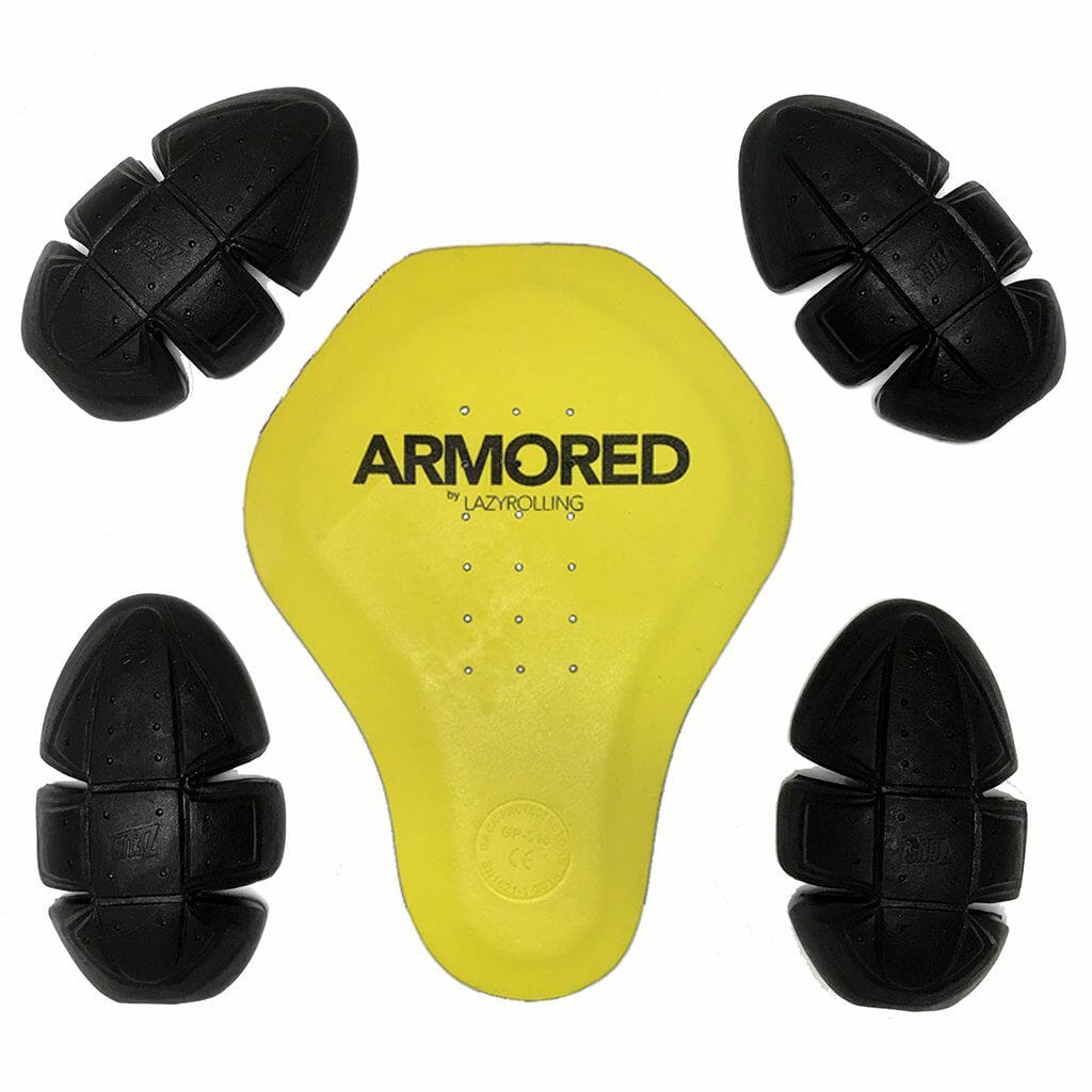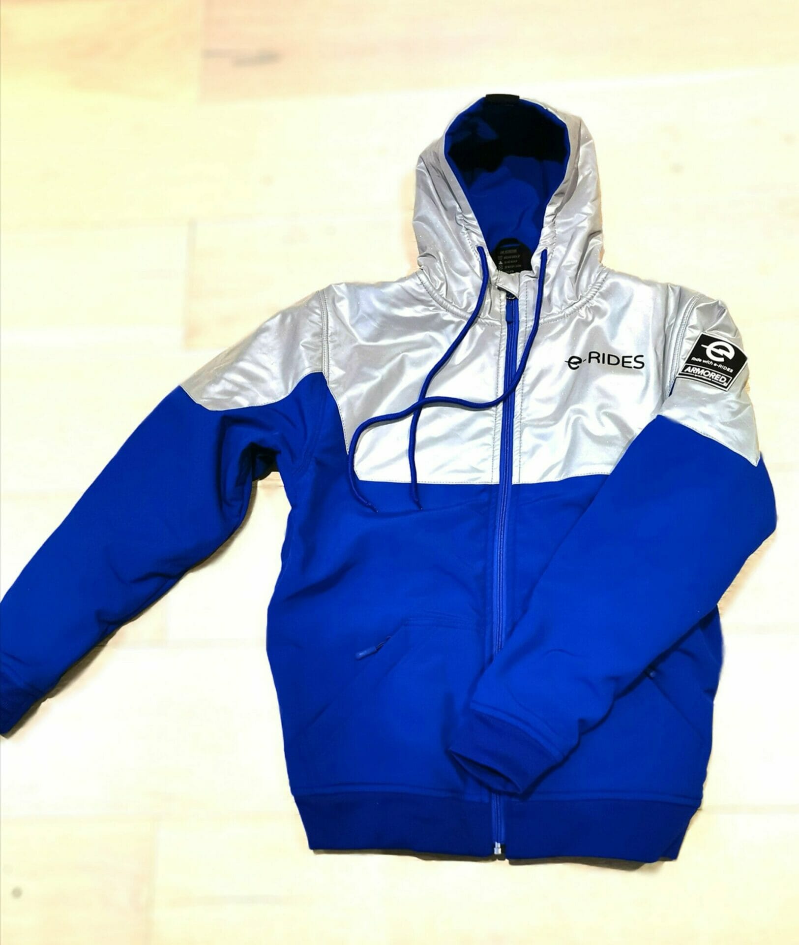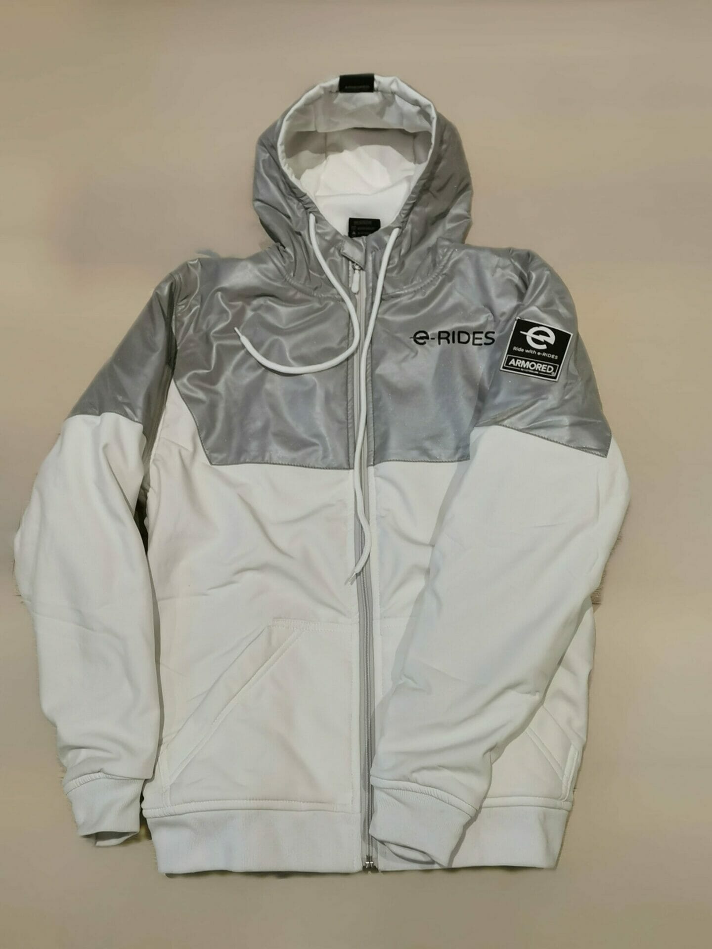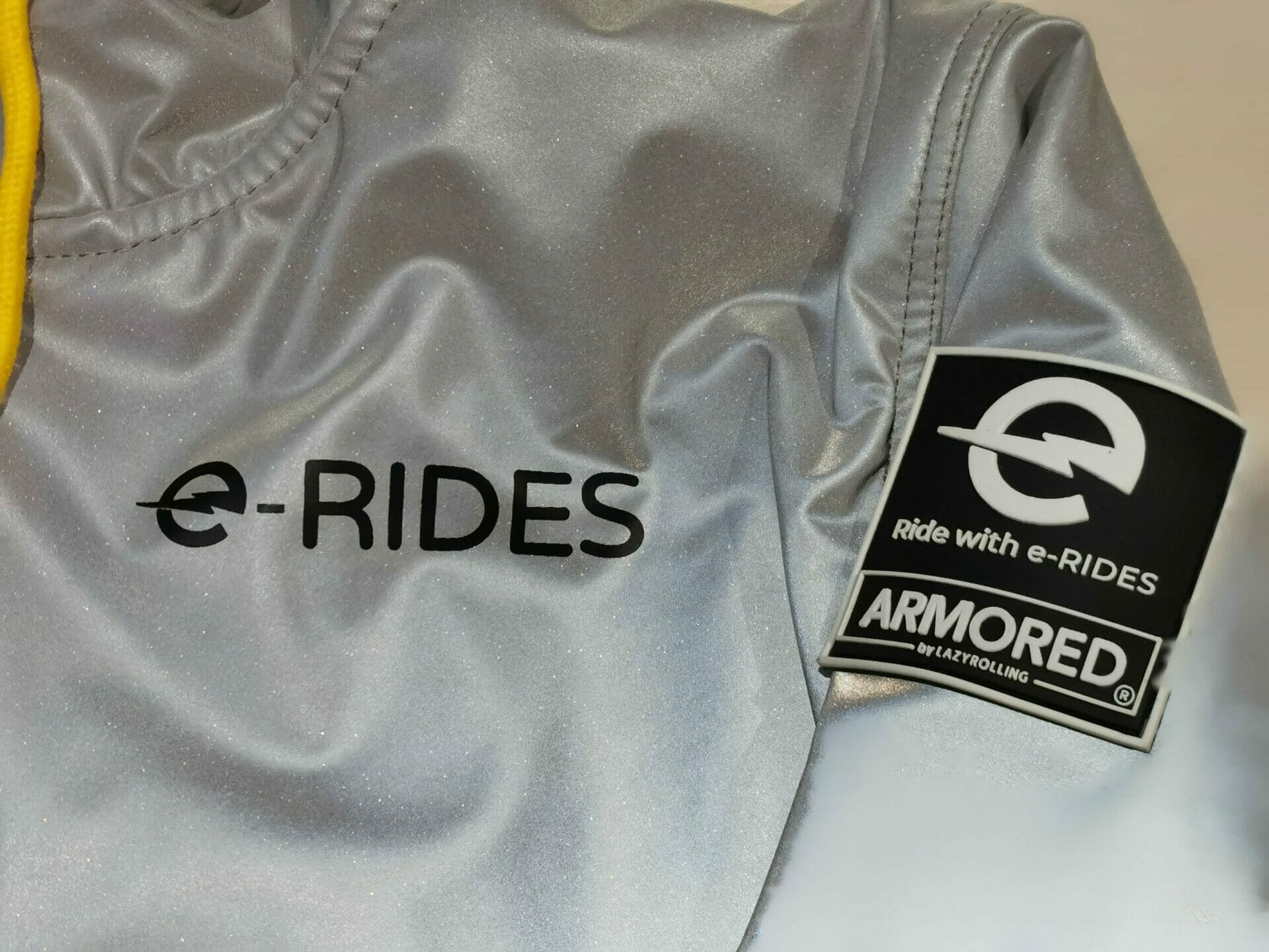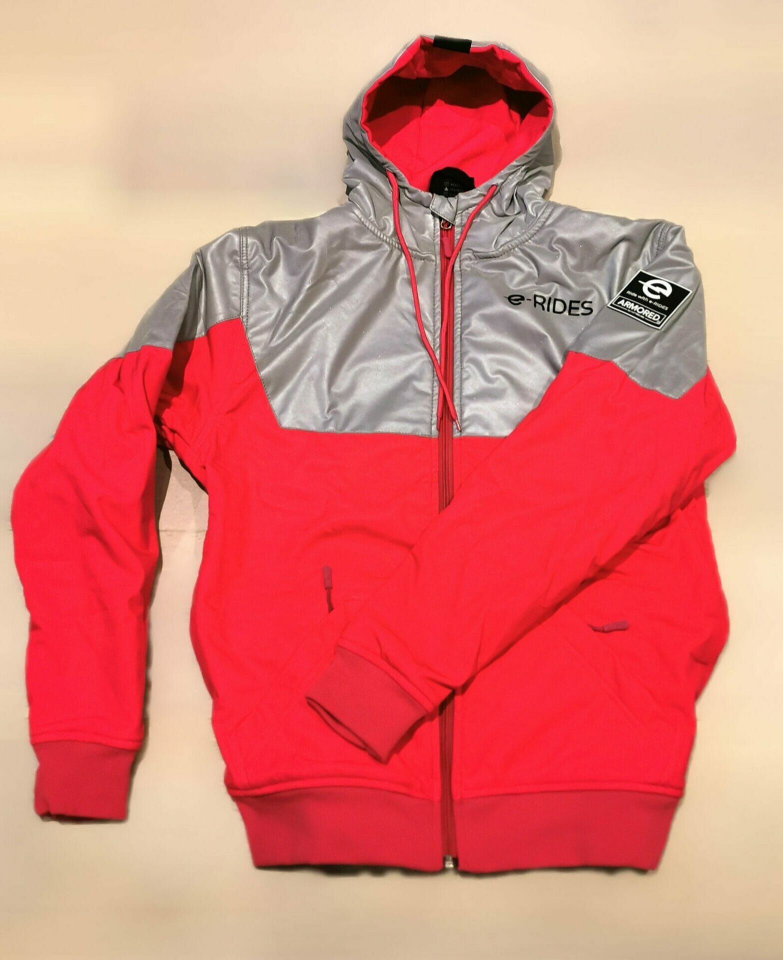 This is the e-RIDES ARMORED reflective jacket with Chest protector, designed in partnership with LAZYROLLING. Comes in e-RIDES traditional Yellow, Hot Pink, Blue and Arctic White.